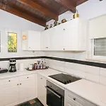 Eine voll ausgestattete Küchenzeile von der Country House Filippos - Private Garden Escape ist mit einem Wasserkocher, einem Kühlschrank und einem Herd ausgestattet.